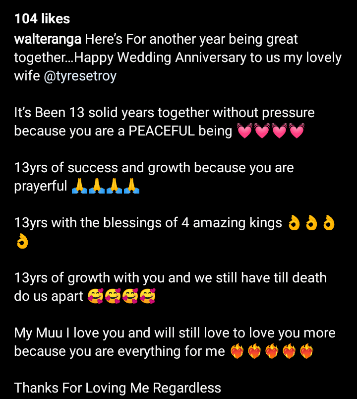 His post read: “Here’s For another year being great together… Happy Wedding Anniversary to us my lovely wife @tyresetroy. It’s Been 13 solid years together without pressure because you are a PEACEFUL being♥♥♥.