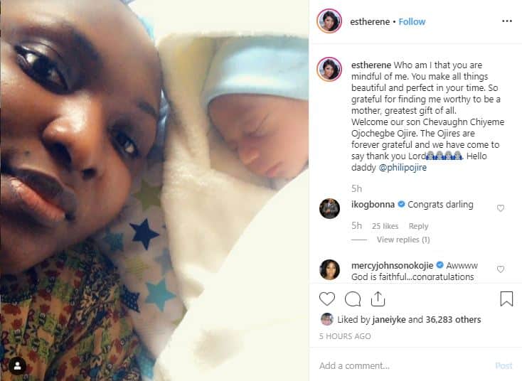 Actress Esther Audu Ojire and her husband Philip Ojire have welcomed a baby boy after 3 years of marriage. The actress excitedly took to social media to share first photo of the baby which she calls Chevaughn Chiyeme.
