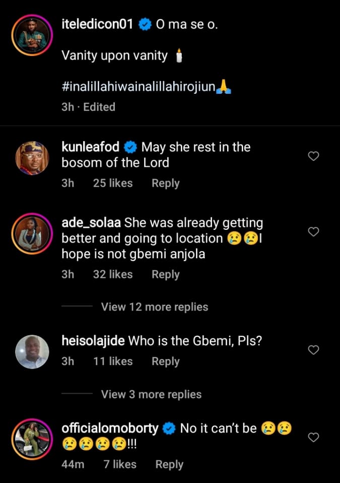 Nollywood stars such as Nkechi Blessing, Kunle Afod, Biodun Okeowo, and others expressed their condolences in the comments section.