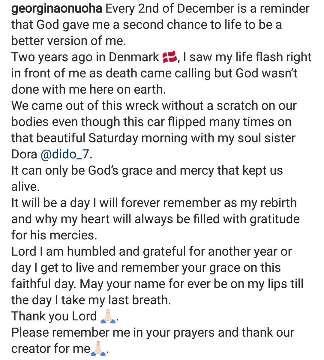 “Every 2nd of December is a reminder that God gave me a second chance to life to be a better version of me. Two years ago in Denmark , I saw my life flash right in front of me as death came calling but God wasn’t done with me here on earth.