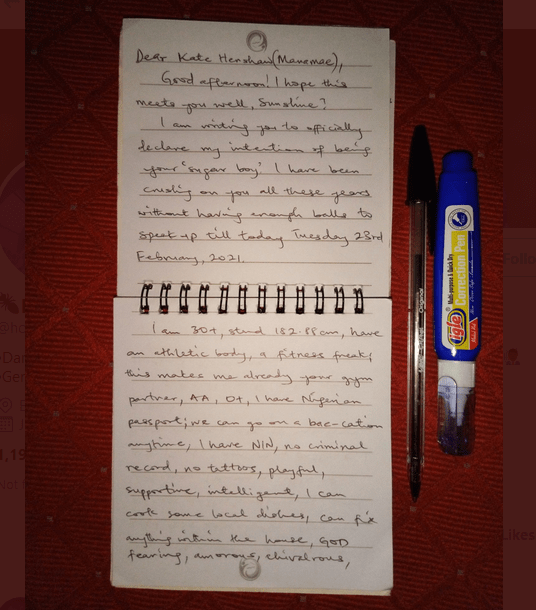 A gentleman doesn’t keep a woman waiting. Kindly find attached my official application letter ✉️ @HenshawKate ?? https://t.co/ZEwRg6O3b4 pic.twitter.com/4p8usFr3Ny