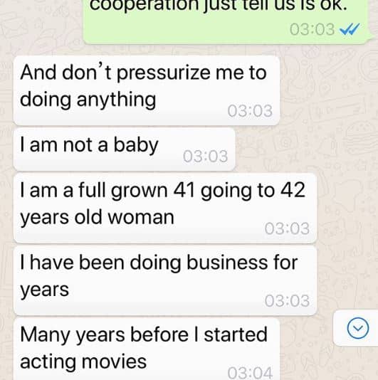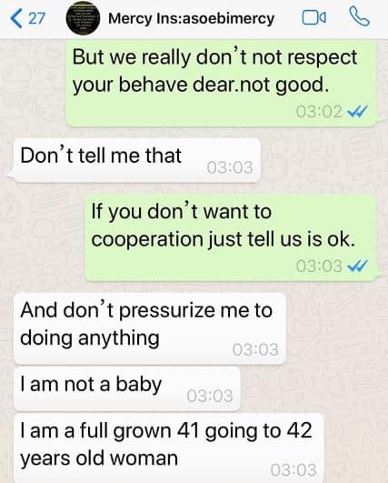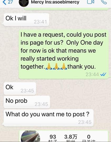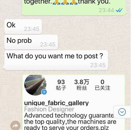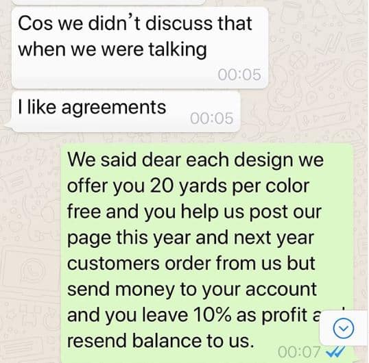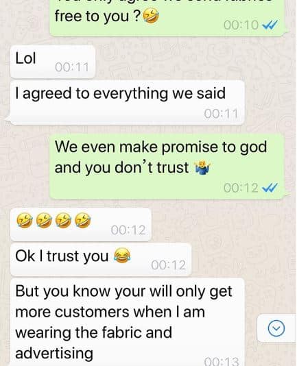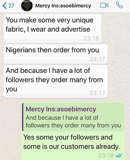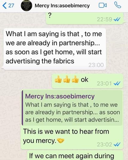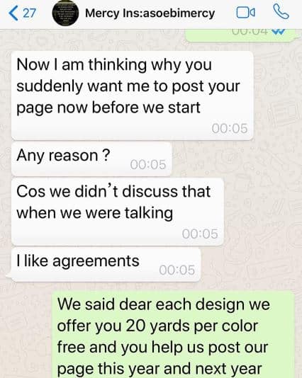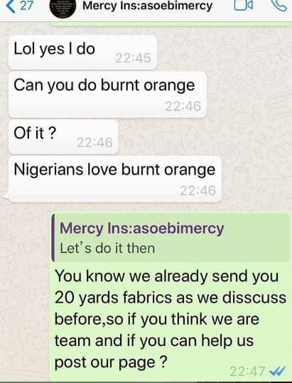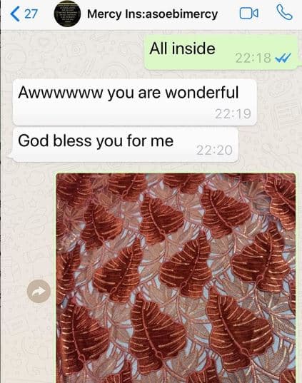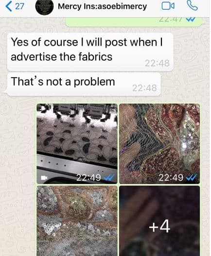 While details of what actually transpired between the aggrieved seller and the Nollywood actress is a bit sketchy, the numerous screenshots of their conversation shared by the fabric seller, suggests Mercy Aigbe neither advertised their business on her page as agreed nor pay for some fabrics.