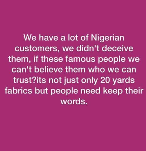 The seller who goes under the Instagram name, @unique_fabric_gallery, accused the actress and mother of two of getting away with 20 yards of fabrics and breaching their agreement.