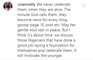 “We never celebrate them, when they are alive. The minute God calls them, they become news for every blog, gossip page, IG post etc. May her gentle soul rest in peace. But I think it’s about time, we discuss those Nigerians that have done a good job laying a foundation for themselves and celebrate them. It will motivate the younger generation.