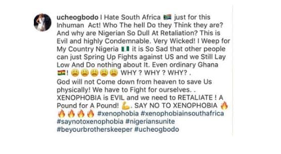 Uche Ogbodo however got lampooned by Nigerians and South Africans, forcing her to delete the post and turn off her comment section on Instagram.