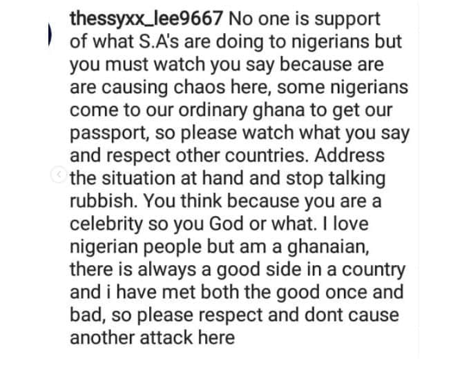 The mother of one had described the attacks as inhumane and also called for a retaliation. She further roped in “ordinary” Ghana into her rant of countries that spring up fights against Nigeria with no ‘equal response’.