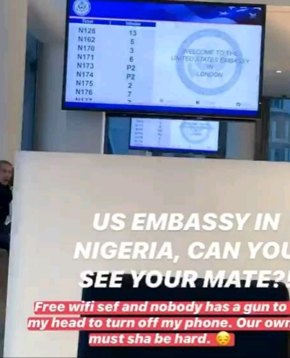 “US Embassy in Nigeria, can you see your mate? Free WiFi sef and nobody has a gun to my head to turn off my phone. Our own must be hard sha.”