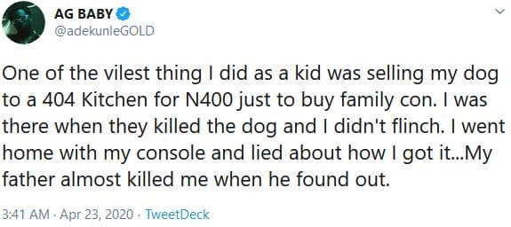 “One of the vilest things I did as a kid was selling my dog to a 404 Kitchen for N400 just to buy family con.” he tweeted.