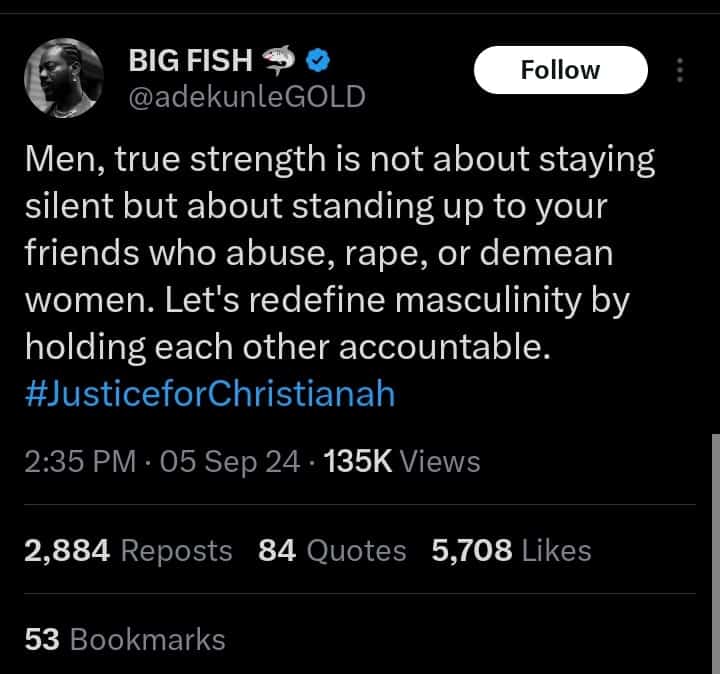 Following the death of this young lady, Adekunle Gold dropped a message to men on his X account. He wrote: