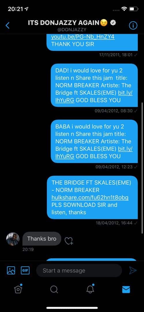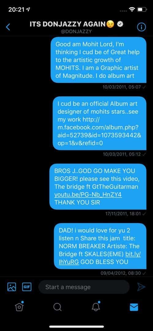 He also consistently sent links to Don Jazzy, begging him to listen and share some songs.