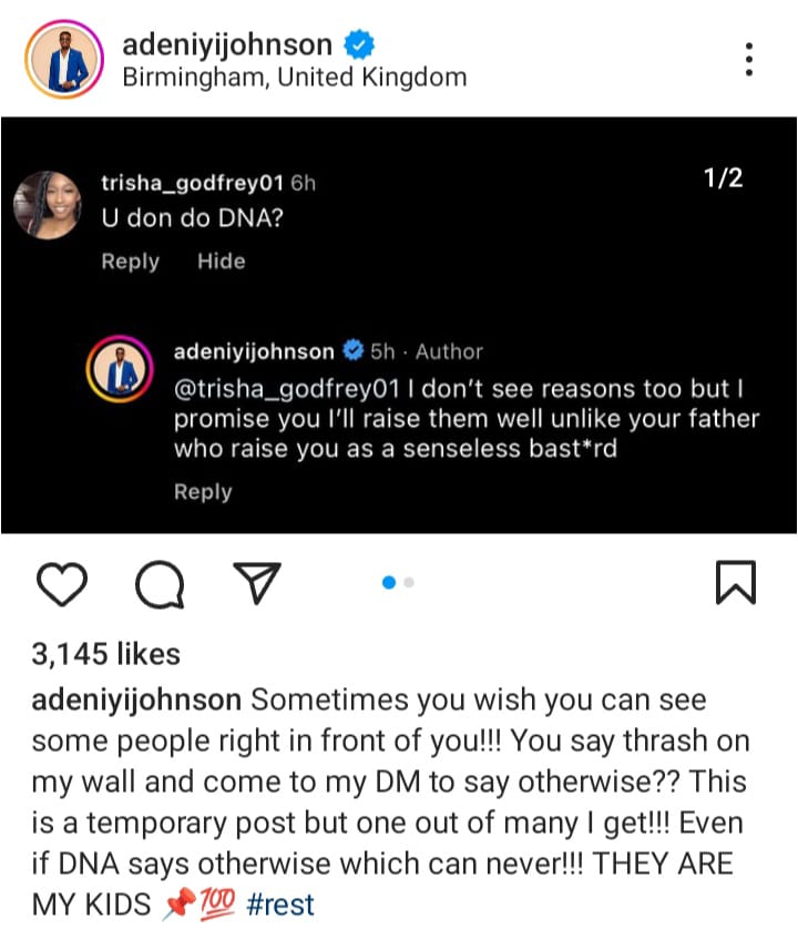 “Sometimes you wish you can see some people right in front of you!!! You say thrash on my wall and come to my DM to say otherwise?? This is a temporary post but one out of many I get!!! Even if DNA says otherwise which can never!!! THEY ARE MY KIDS 📌💯 #rest”