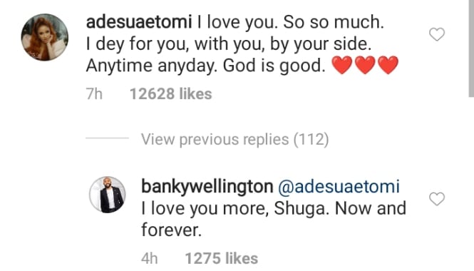 Banky W responded: “@adesuaetomi I love you more, Shuga. Now and forever.”