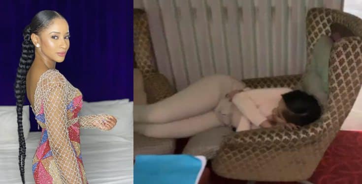 BBNaija reality star, Bisola has shared a rare footage of talented actress Adesuwa Etomi Wellington sleeping on the set of a movie location.