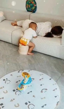 In the captivating video, the mother appears to be losing her balance and sliding close to the edge of the cozy sofa.