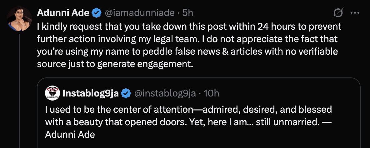 However, Adunni Ade swiftly took to the platform to refute the statement and set the record straight. Quoting the post directly, she issued a strong warning and demanded that the false narrative be taken down within 24 hours.