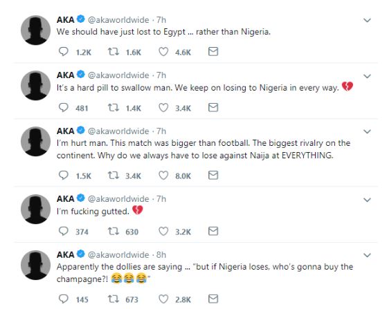 AKA in his tweet about the match, described it as the biggest rivalry on the continent and wondered why South Africa loses to Nigeria in everything.