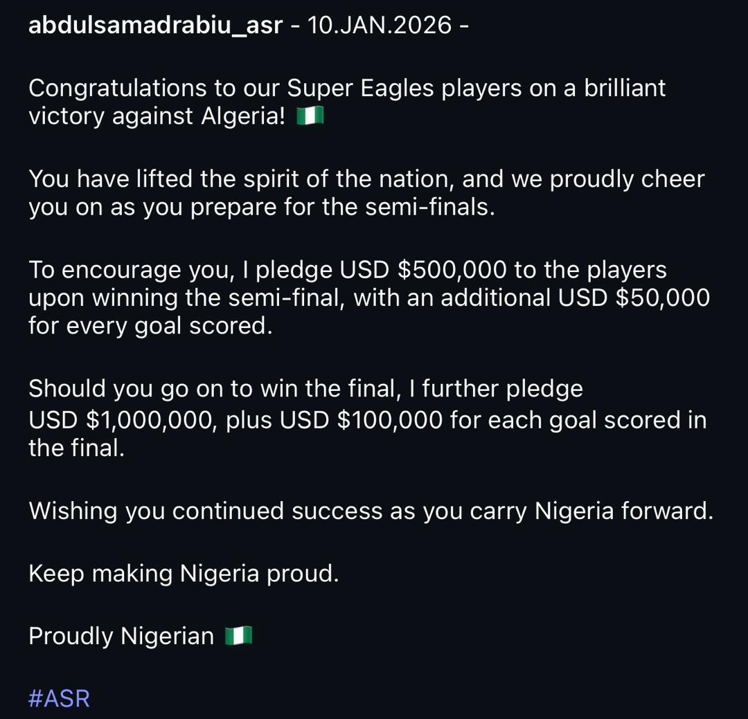 In a public post shared on his Instagram page after the match, the billionaire businessman praised the players for lifting Nigeria’s spirit and announced massive cash incentives ahead of the semi-finals.