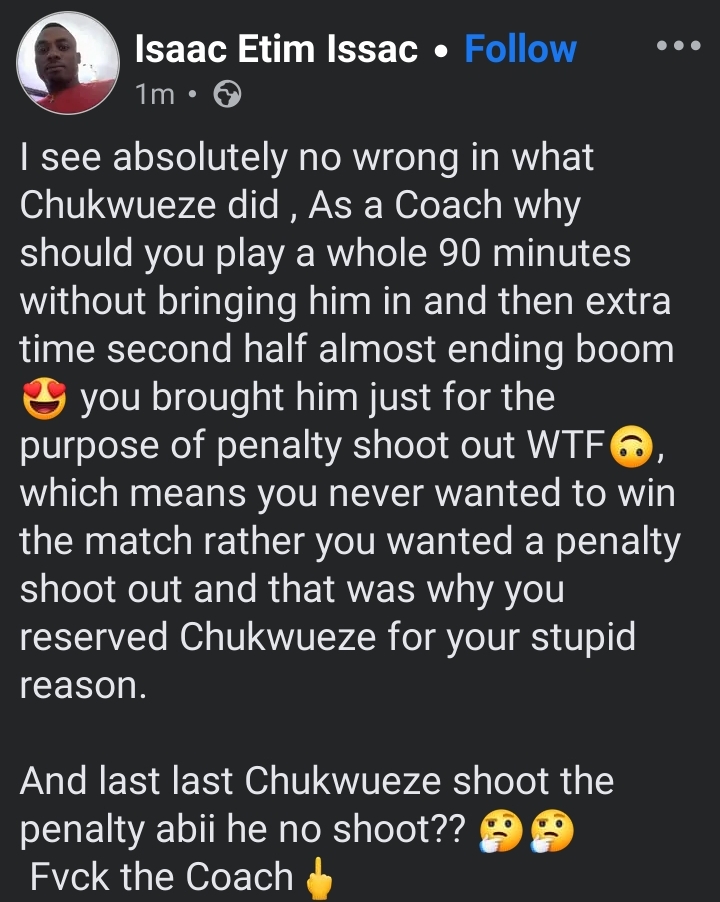 In a Facebook post, a user identified as Isaac Etim Isaac defended winger Samuel Chukwueze after he missed a crucial penalty in the shootout.