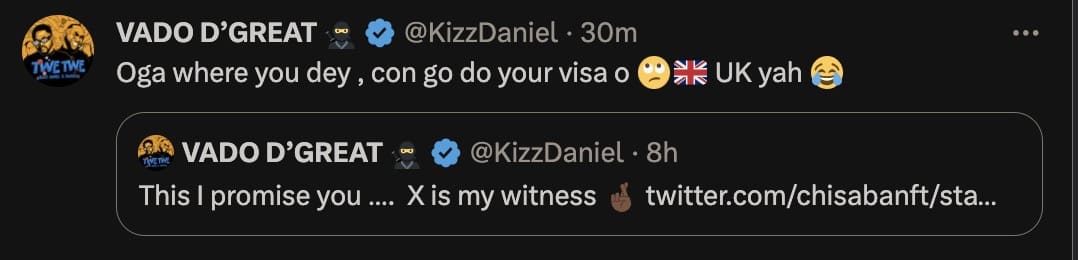 “Vado if super eagle wins today , take me to your next show, ovo arena,” the fan quizzed.