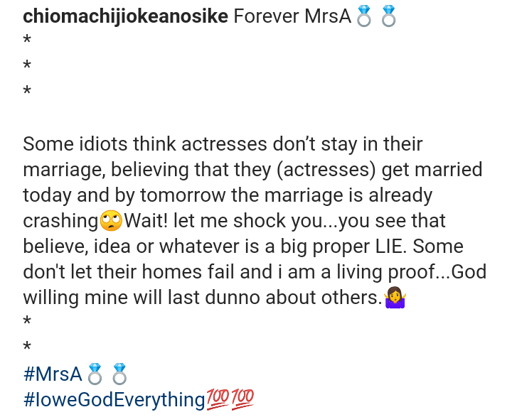 She wrote, “Forever MrsA??Some idiots think actresses don’t stay in their marriage, believing that they (actresses) get married today and by tomorrow the marriage is already crashing?Wait! let me shock you…you see that believe, idea or whatever is a big proper LIE. Some don’t let their homes fail and i am a living proof…God willing mine will last dunno about others.?♀️