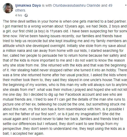 There was a time she returned home after her usual practice, I asked the kids where their mother took them to, they said they stayed in one uncle’s house.That was the beginning of my worries, who is this man my wife will always run to anytime she steals from me? .what was their motive,I prayed and hoped she will not kill me one day. So I decided to dig up her Facebook account and see who are mutual friends are, I tried to see if I can get the details of the man she runs to. I picture one of her ex, believing he could be the one, but something struck me about this man, my first son has a form resemblance with him, is it possible I am not the father of our first son?, or is it just my imagination? She did the usual again and I vowed never to take her back ,families and friends tried to settle our differences but I refused, they don’t want to see things from my perspective ,they don’t seem to understand me, they kept using the kids as a bait, I accepted her again.