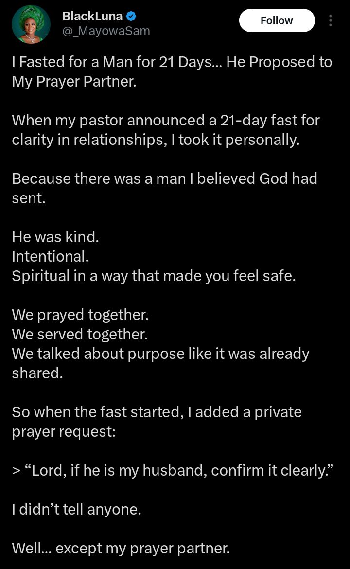 “After 21 days of fasting for love, he proposed to my prayer partner” — Lady laments