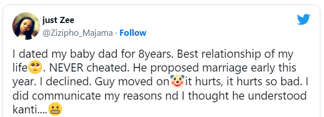 “I dated my baby dad for 8 years. Best relationship of my life. NEVER cheated. He proposed marriage early this year. I declined. Guy moved on. It hurts, it hurts so bad. I did communicate my reasons and I thought he understood kanti.