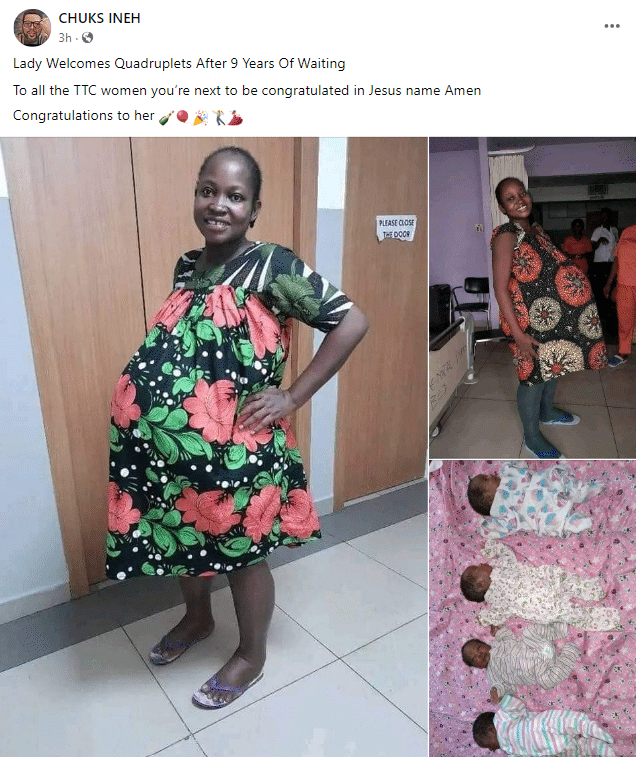 A woman who had patiently waited for 9 years to embrace motherhood has been blessed with quadruplets.