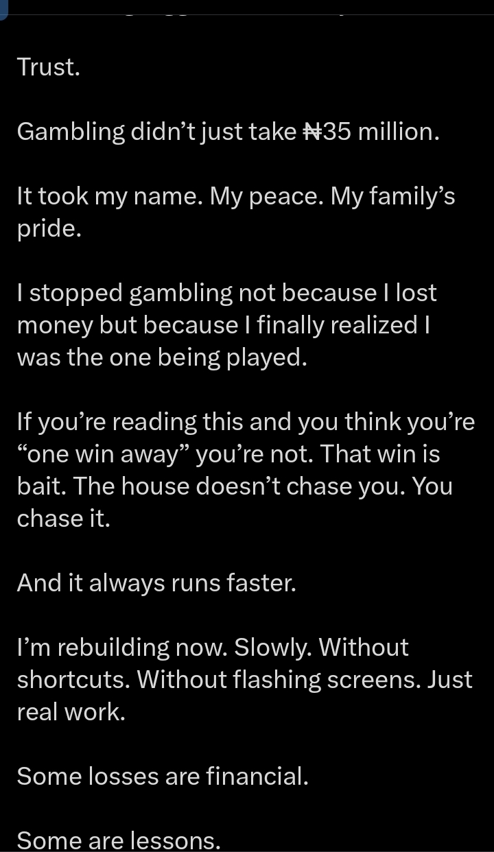 The X user further shared that he sold his family’s inheritance for ₦35 million and lost it all to betting.