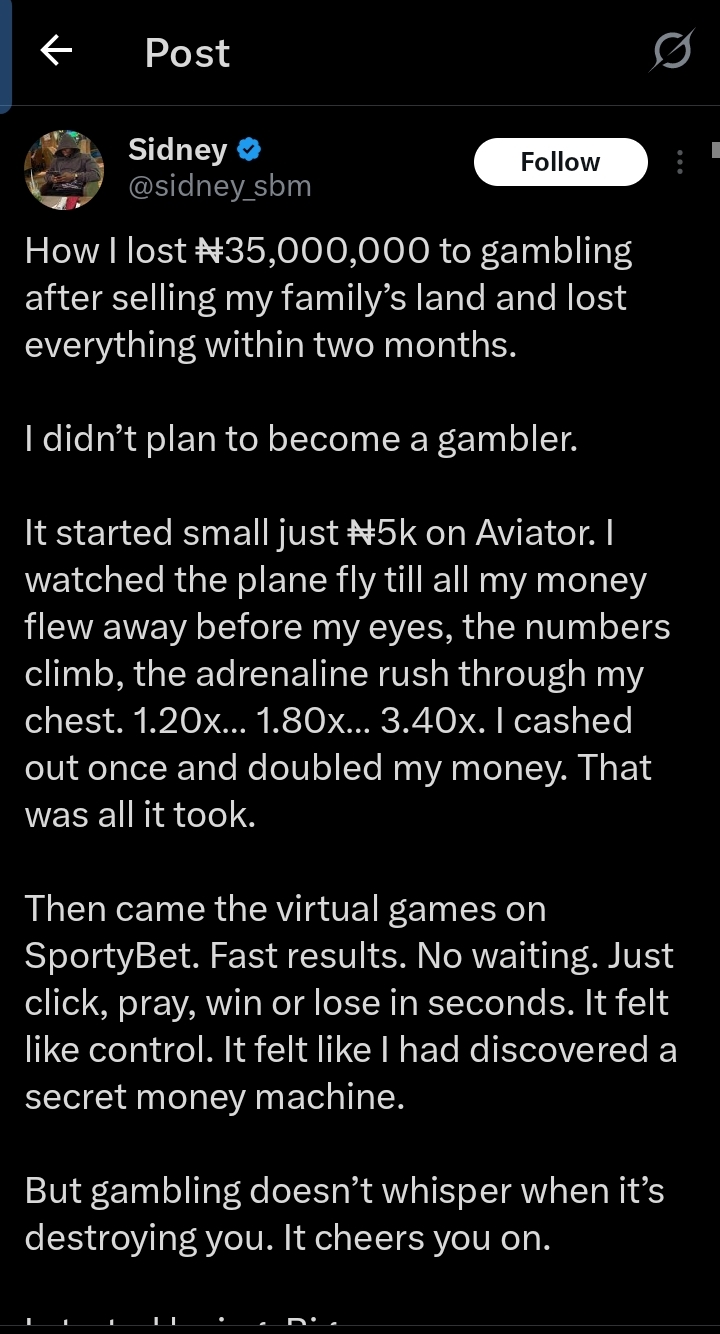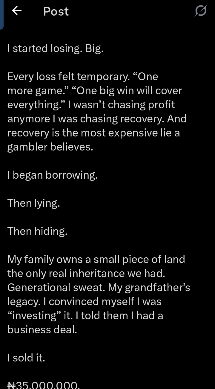 An X user has shared a heartbreaking account of losing ₦35 million to betting after selling his family’s land.