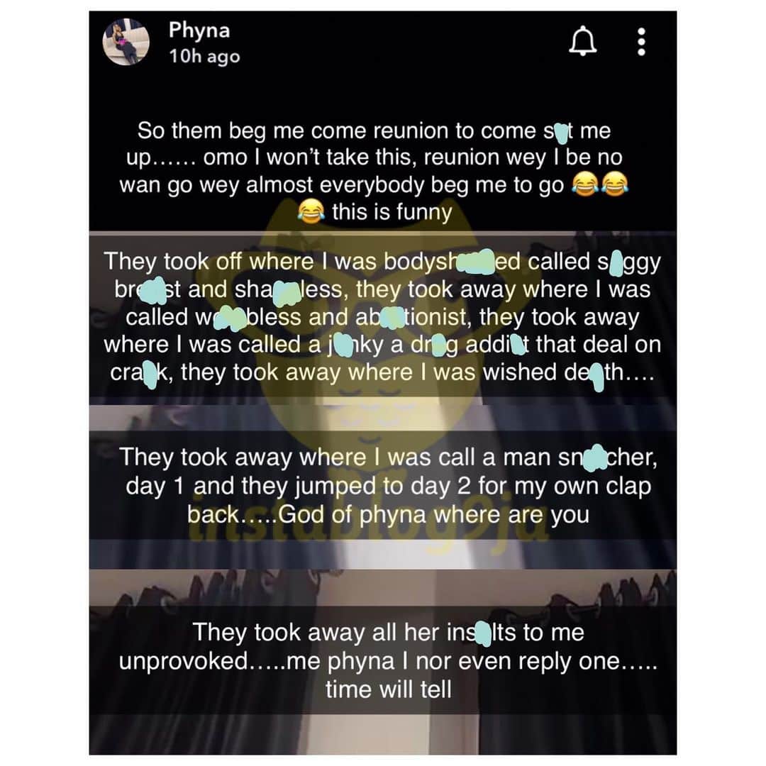 Popular reality star, Phyna drags organizers of the BBNaija show as she alleges that they edited out scenes where she was heavily insulted and shamed during the ongoing reunion.