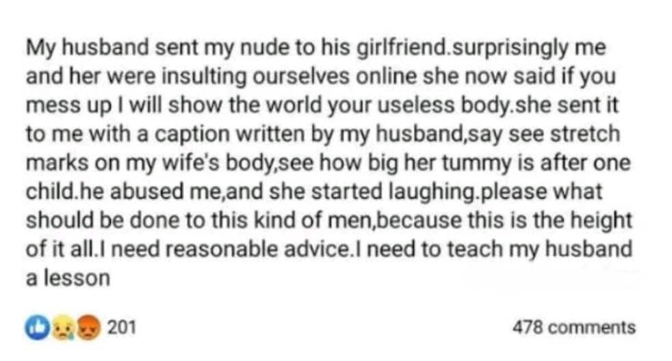 A heartbroken wife has cried out on social media after she discovered that her husband sent her nude photos to his side chick in a bid to body shame her.