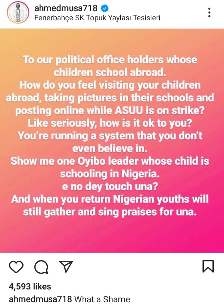 Following this, the Super Eagles’ captain, berated politicians who are in the habit of sending their kids abroad while Nigerian students are at home.