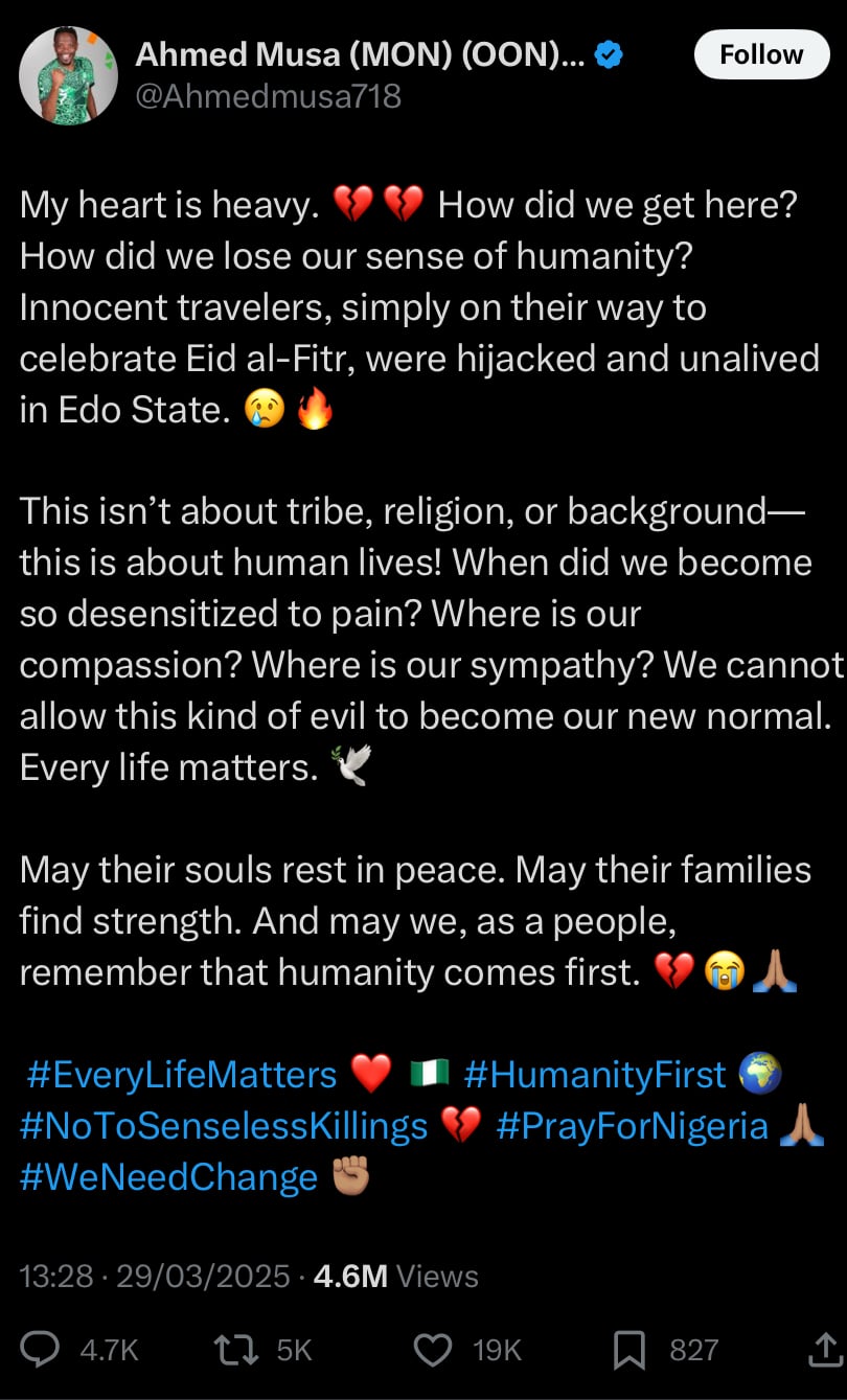 Super Eagles player, Ahmed Musa, has expressed his deep sorrow and concerns following the tragic hijacking and killing of innocent travelers in Edo State.