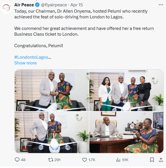 Prominent Nigerian airline, Air Peace makes an impressive offer to the travel enthusiast, Pelumi Nubi who drove from London to Lagos.
