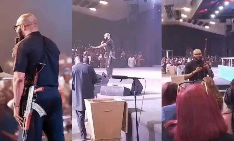 Alarm as pastor mounts pulpit to preach with AK-47 rifle in Abuja (Video)