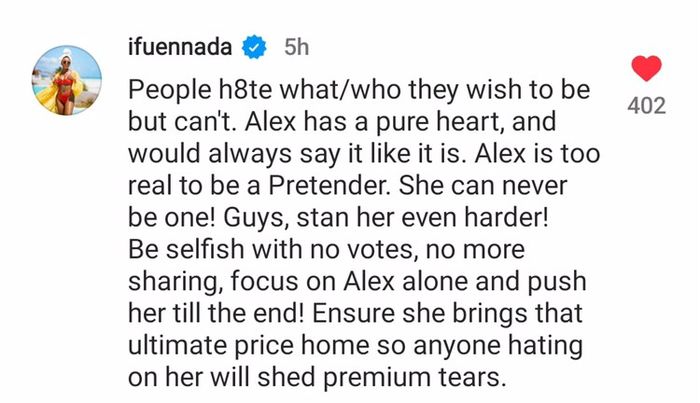 Praising Alex, Ifu Ennada said, “People hate what/who they wish to be but can’t. Alex has a pure heart, and would always say it like it is. Alex is too real to be a pretender. She can never be one! Guys, stan her even harder!