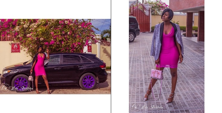 Alex rocked a body Hugging pink gown, over a silver heels which goes with the silver leopard print jacket hung over her shoulder and finally a pink bag, the TV star posed pretty in front of her new car, giving her Haters more things to talk about.