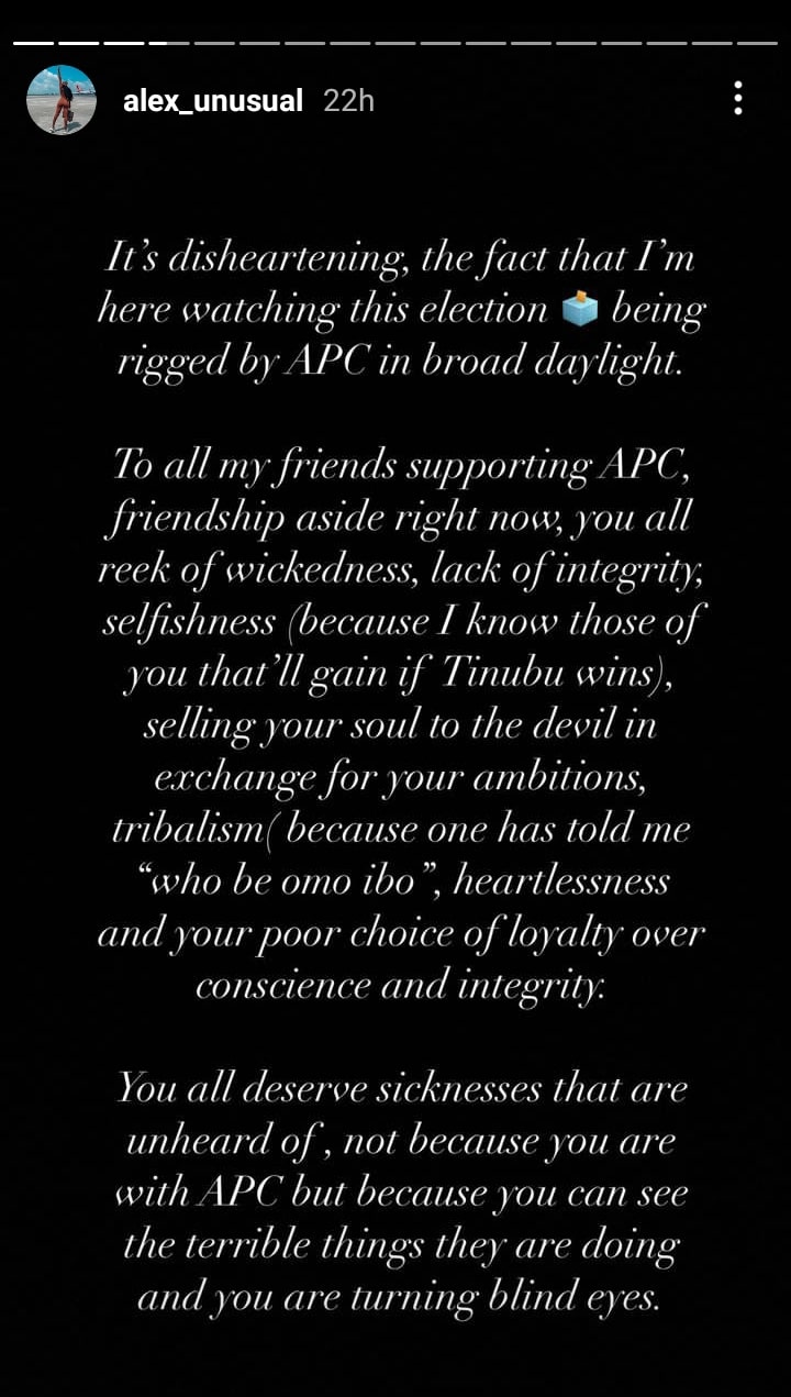 The reality star took to her Instagram page to rant over alleged rigging being carried out by the All Progressive Congress and some celebrities who still support them despite their blatant corrupt practices.
