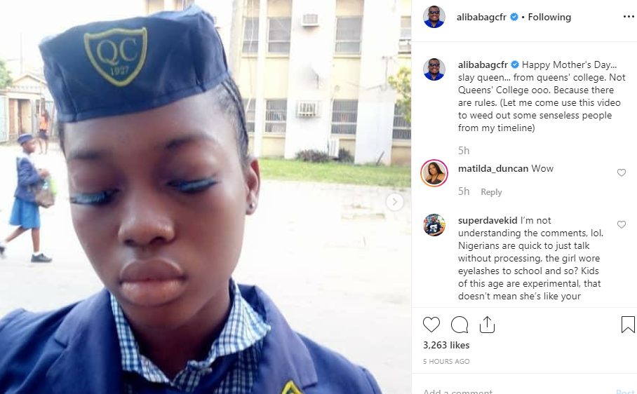 Alibaba wrote “happy Mother’s Day… slay queen… from queens’ college. Not Queens’ College ooo. Because there are rules. (Let me come use this video to weed out some senseless people from my timeline)”