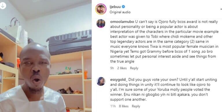Some individuals agreed with Ijebu’s allegations of foul play, while others argued that Femi Adebayo’s movie, “Ageshinloke,” might not have garnered enough votes to secure an award at the AMVCA.