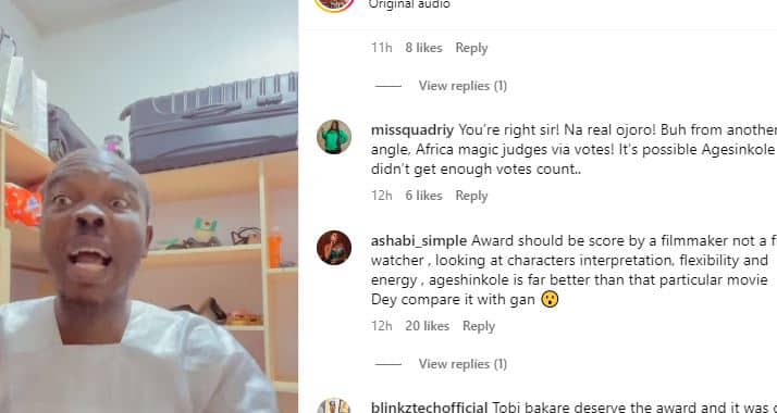 “U can’t say is Ojoro fully bcos award is not really about personality or being a popular actor is about interpretation of the characters in the particular movie example best actor was given to Tobi where chidi mokeme and other top legendary actors are in the same category (2) same in music everyone knows Tiwa is most popular female musician in Nigeria yet Tems got Grammy before bcos of 1 song ,so bro sometimes let put personal interest aside and see things from the true angle”