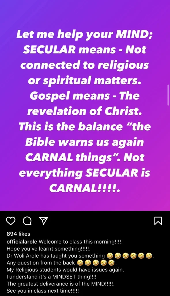 “Stop being an hypocrite now, you don’t listen to SECULAR SONGS but you watch SECULAR movies, you watch FOOTBALL. Is there a gospel football club. All these your religious mindset won’t advance your life. The yardstick for all we do is “EDIFICATION”. There are LOVE songs, there are moral songs, there are ethical songs. Stop being RELIGIOUS alaye!!!