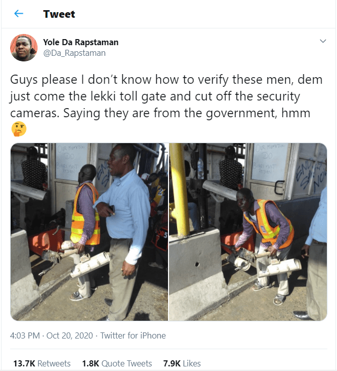 “Guys please I don’t know how to verify these men, dem just come the lekki toll gate and cut off the security cameras. Saying they are from the government, hmm ?” he tweeted.