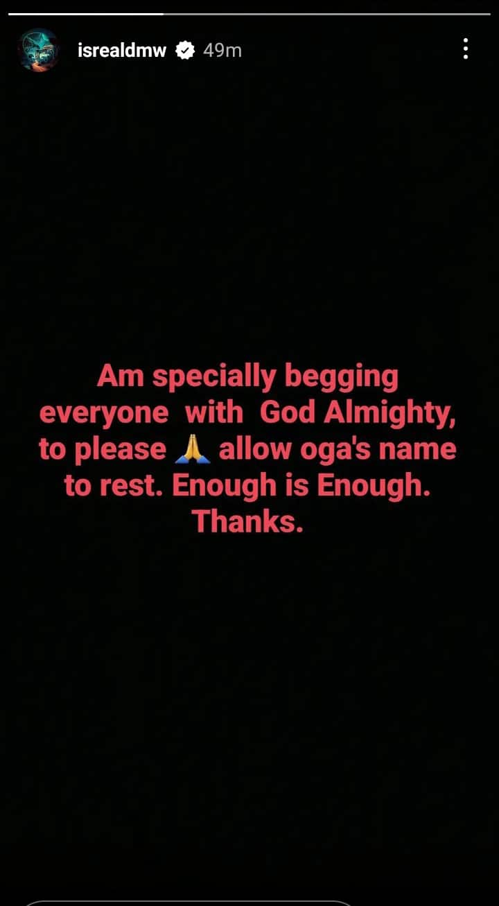 “Am specially begging everyone with God Almighty to please allow oga’s name to rest. Enough is enough. Thanks.”