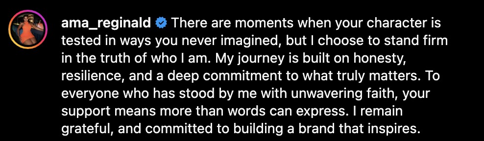 Amid the controversy, Ama Reginald took to Instagram, sharing stunning pictures of herself in a white dress alongside a reflective caption. She emphasized her commitment to truth and resilience despite the challenges she faced.