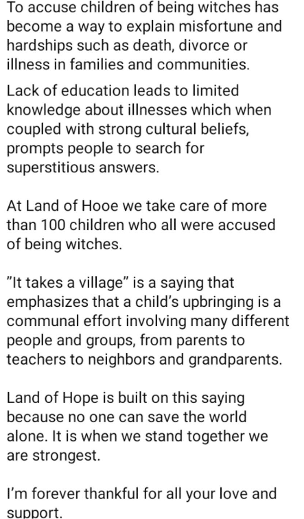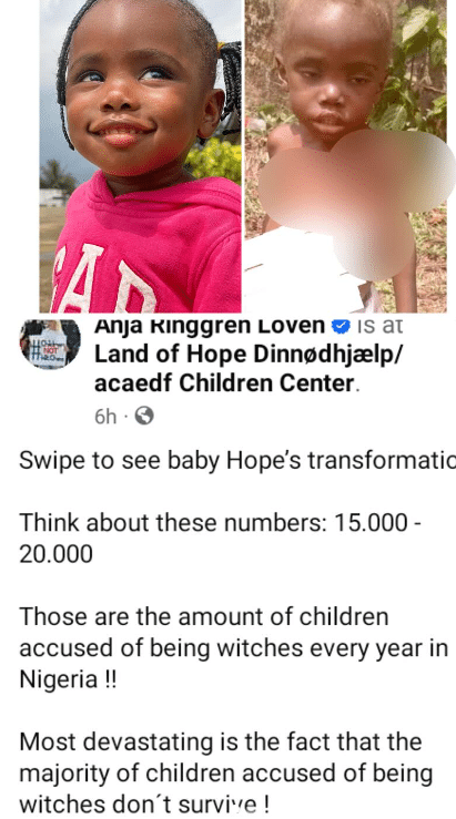 “Swipe to see baby Hope’s transformation. Think about these numbers: 15.000 – 20.000. Those are the amount of children accused of being witches every year in Nigeria,” she wrote in a Facebook post on Friday.
