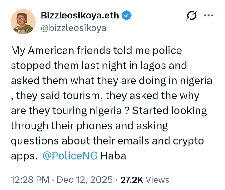 @bizzleosikoya said: “My American friends told me police stopped them last night in lagos and asked them what they are doing in nigeria , they said tourism, they asked the why are they touring nigeria ? Started looking through their phones and asking questions about their emails and crypto apps.