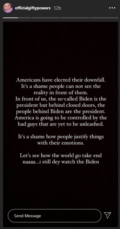 Former big brother Naija housemate, Gifty Powers, has reacted to U.S. president-elect, Joe Biden’s win.