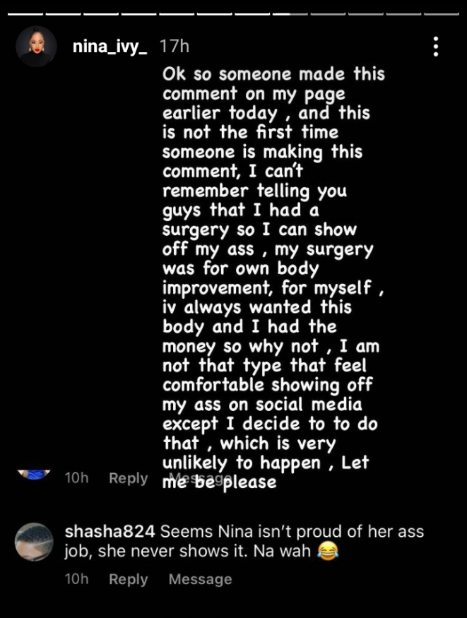Reality TV star, Nina Ivy has finally disclosed why she doesn’t flaunt her new body on social media.
